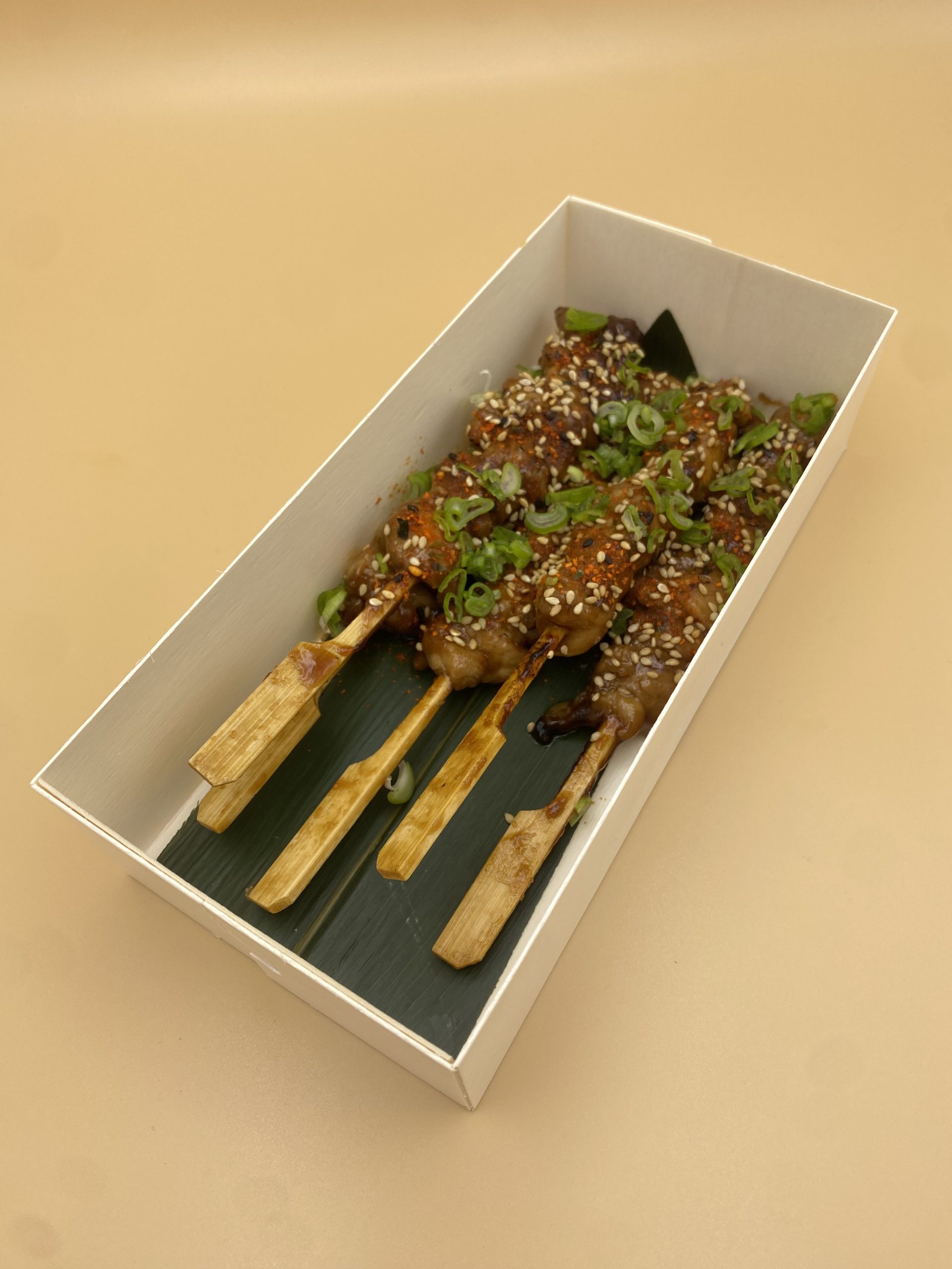5 Spiedini di Pollo Biologico grigliato in stile Yakitori con cipollotto mix di 7 spezie piccanti giapponesi, semi di sesamo e cipollotto, l’affumicato degli spiedini si sposa meravigliosamente con la freschezza del cipolloto ed il kick finale del piccante, possibile togliere il piccante, scrivetelo nelle note ordine please.